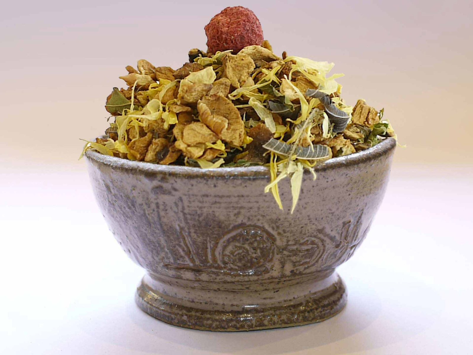 Ingrédients: Pomme*, rooibos vert*, verveine coupée*, écorces d’orange*, arôme naturel, pétales de souci*, verveine entière*, feuilles de mûrier*, framboises entières*, herbe de passiflore*, groseilles rouges*. *Issu de l’agriculture biologique
